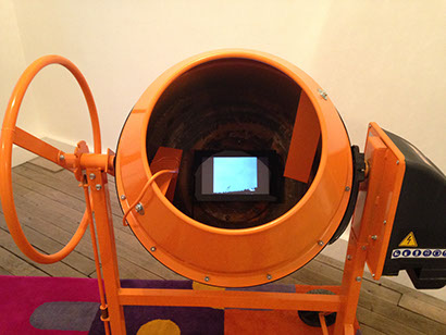 Détail de la scéno de Bernard Moise à base d'écrans placés dans des bétonneuses.